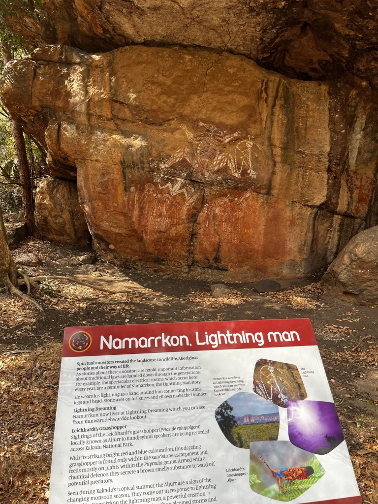 After lunch, we made our way up to Nourlangie, an area known for its Aboriginal rock paintings. Aboriginal rock art was traditionally done to tell stories, teach lessons, or provide details about the local area. Of particular interest was the painting of Namarrkon, Lightning Man.