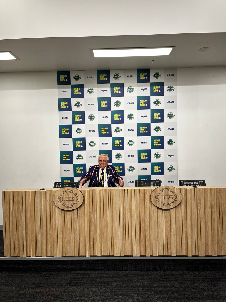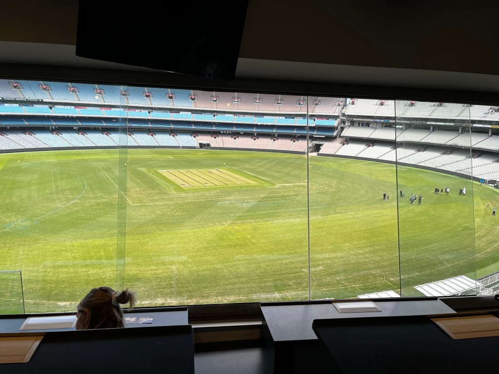 I went inside and was met by Barrie, our tour guide. He was 85 years old and full of energy, excited to show us around the grounds. We first went onto the field, where we saw the groundskeepers doing some watering. The Grand Final had been just a few weeks prior, so they were getting ready for cricket.